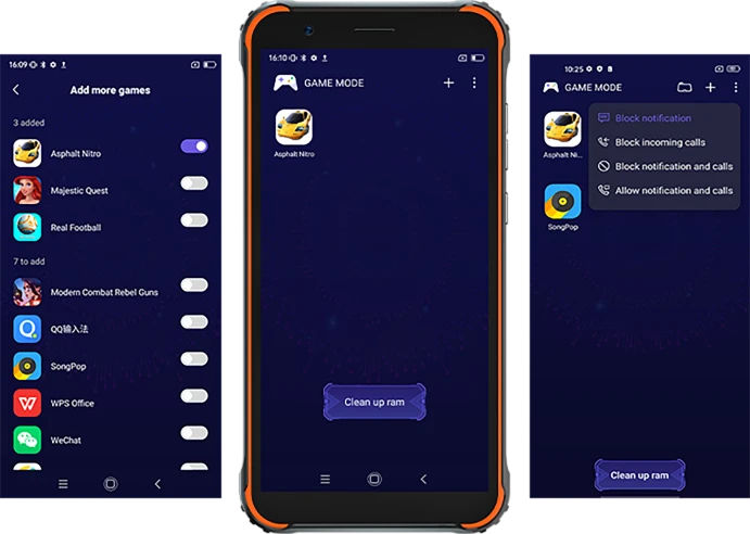 Очистка памяти, блокировка входящих вызовов, уведомлений, ускорение в играх до 30%.