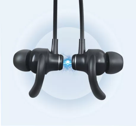 Наушники содержат магнит, прилипая друг к другу образуют замкнутый круг, что исключает возможность утери.